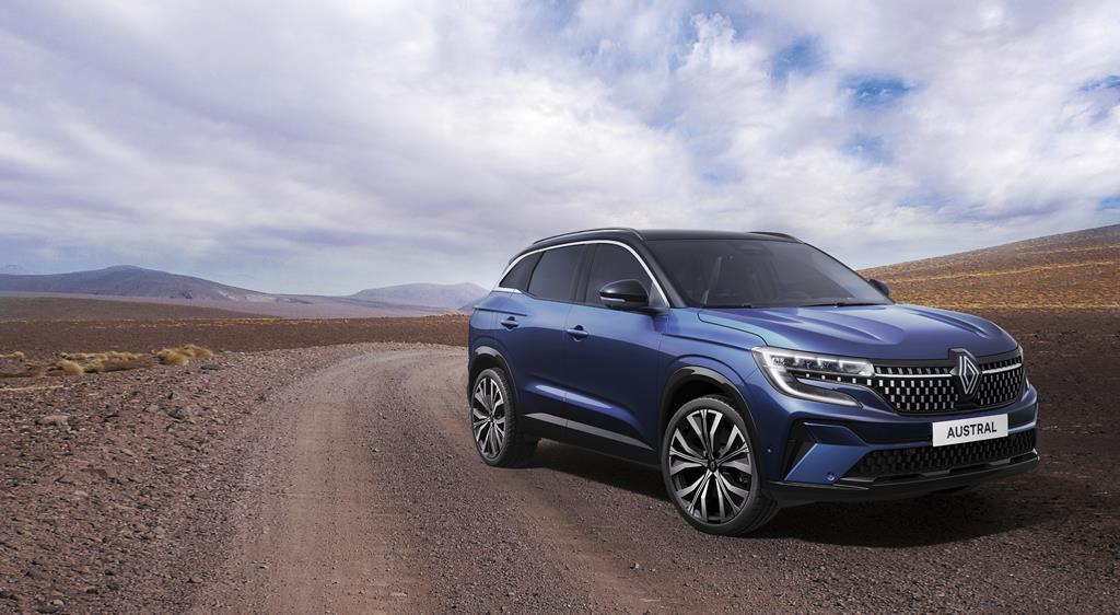 Yeni Renault Austral cesur ön yüzü ve ayırt edici farlarıyla kendini gösteriyor. Zarif hatları parlak siyah tavanı, öne çıkan yan korumaları güçlü ve kaslı tasarımını ortaya çıkarıyor.