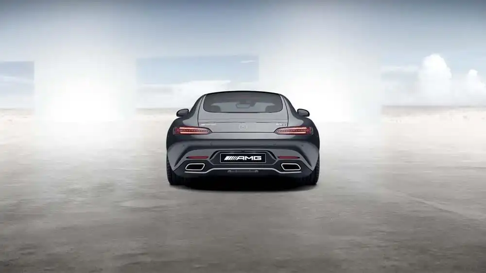 Benzersiz C sütununa sahip arka kaportası yatık araba tasarımı ve hafif bir eğime sahip bagaj kapağı Mercedes-AMG GT'nin dinamizmini vurgular. Sıralı dönüş sinyallerine sahip son derece ince LED stop lambaları, aracın genişliğini gözler önüne serer. Tam entegre egzoz boruları ve belirli bir konikliğe sahip güçlü arka tampon, güçlü tekerleklerin görülmesini sağlar