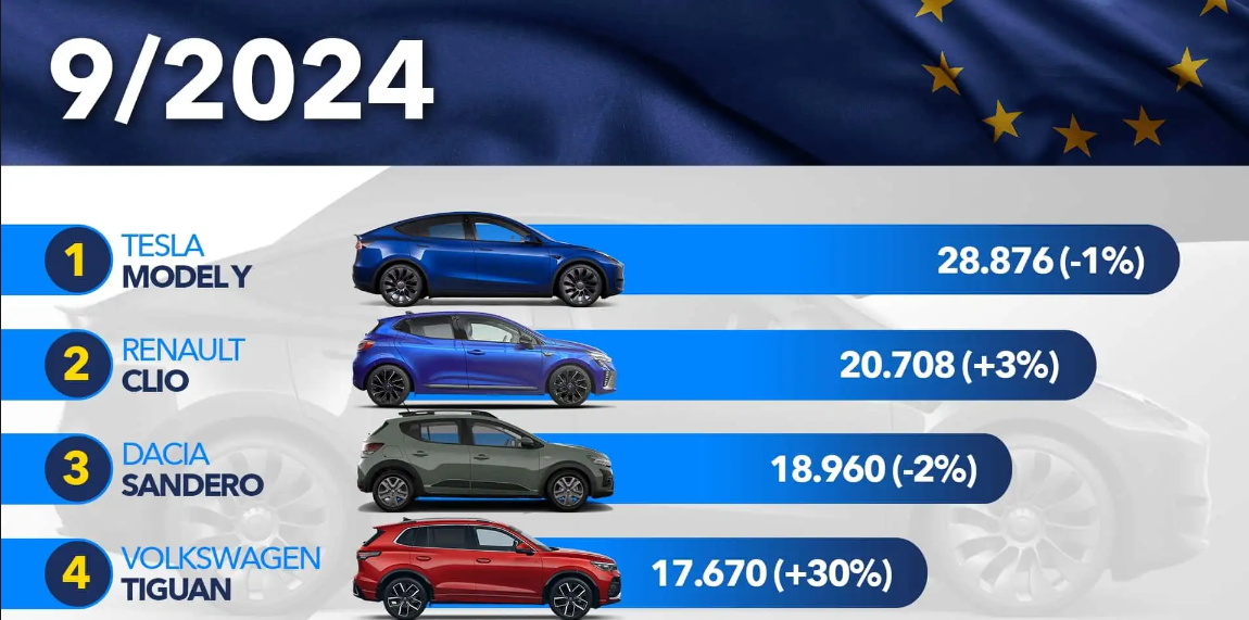 Avrupa'daki en popüler dört araç, genel olarak sabit kalırken, sıralamalarda bazı değişiklikler oldu. Eylül ayında, Renault Clio ikinci sırada yer alırken, Dacia Sandero üçüncü ve Volkswagen Tiguan dördüncü sırada bulunuyor. Tesla Model Y, yaz aylarındaki satış düşüşünün ardından, yılın en çok satan aracı olma yolunda Dacia Sandero ile kıyasıya bir rekabet içinde.
